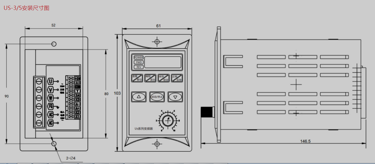 US-3/5系列變頻器體積小,安裝方便;調(diào)試簡單,參數(shù)簡潔易懂,能夠滿足普通場合的要求,是專門針對220V/0.75KW以下的三相交流電機量身定做的,為設(shè)備制造業(yè)廣大客戶提供一體化解決方案,對降低系統(tǒng)成本,及提高系統(tǒng)可靠性具有很高價值。